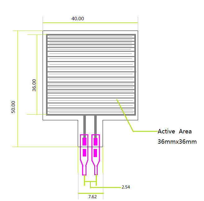 This is a square flexible thin film pressure sensor of short legs with a side length of 40mm, which can be used to realize highly sensitive detection of pressure. The sensor is durable and designed to sense static and dynamic pressure in a high respond speed. Its advantages of recording the intensity and frequency of force make it widely used in all kinds of applications, such as, pressure switch, bed monitoring system, intelligent sneaker and medical device system. These sensors are also very easy to use.